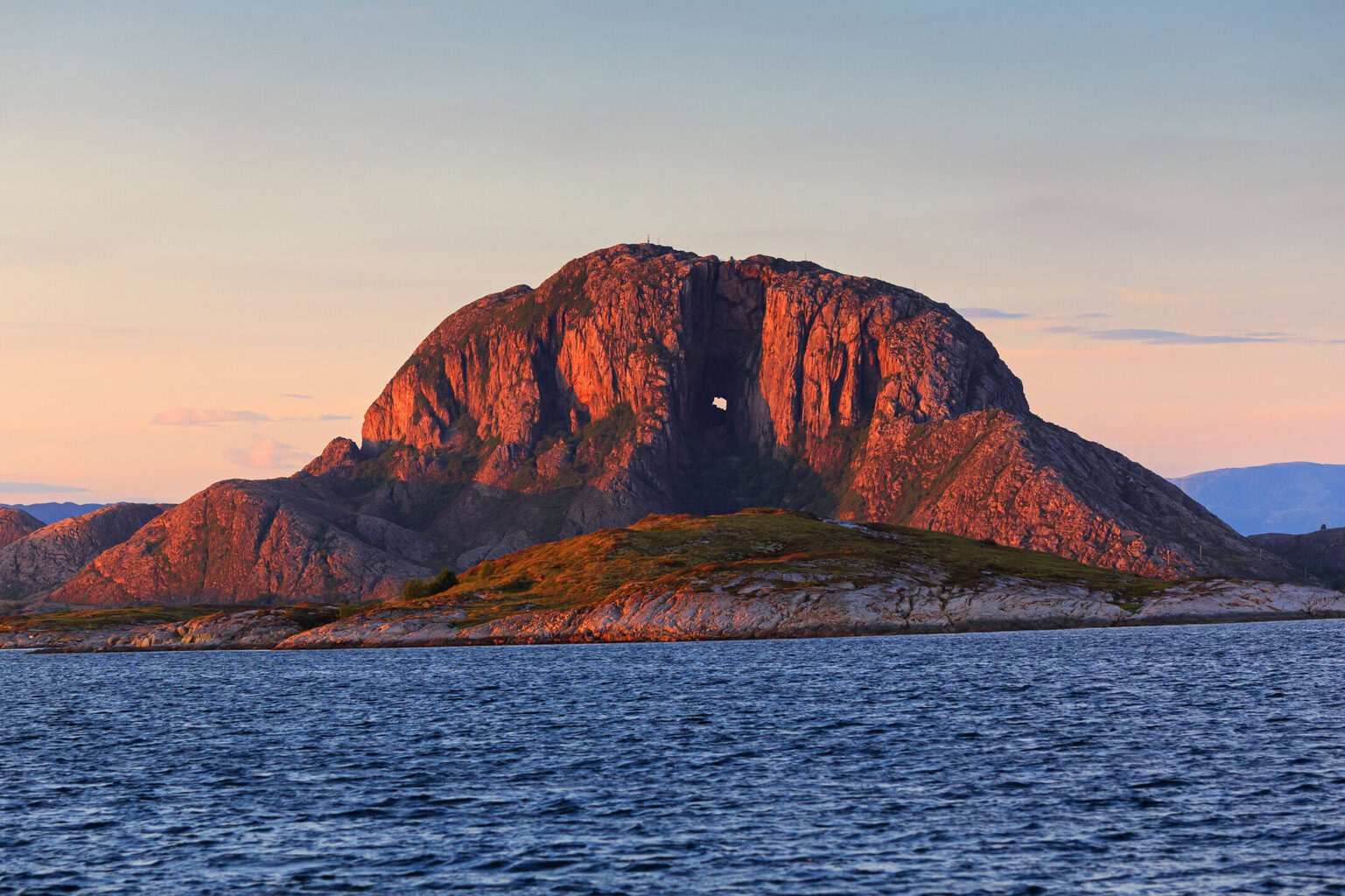 Torghatten is a granite mountain on the island of Torget in Brønnøy Municipality in Nordland count…y, Norway. It is known for its characteristic hole, or natural tunnel, through its center. It is possible to walk up to the tunnel on a well-prepared path, and through it on a natural path. MoreLess
