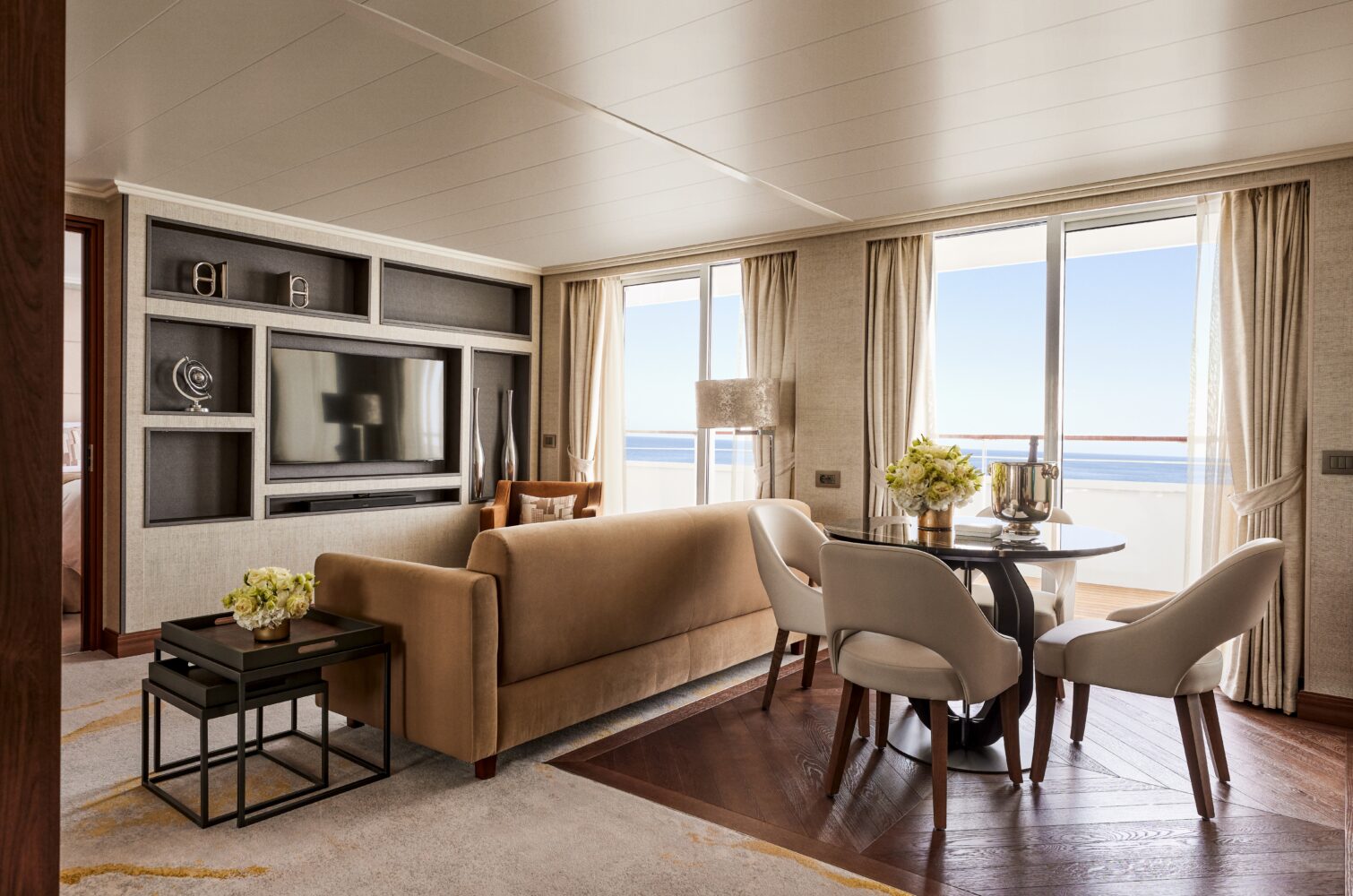 Even entry-level rooms feel considered—airy, elegant, and unmistakably premium. But suites elevate this philosophy into something closer to residential living at sea.
