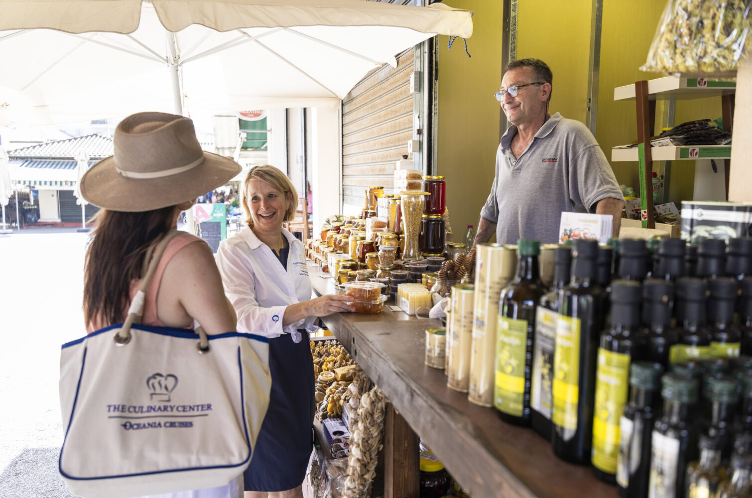 A mix of on-shore and on-board (or resort) experiences: market visits, cooking classes, tasting sessions and talks by local artisans or chefs.