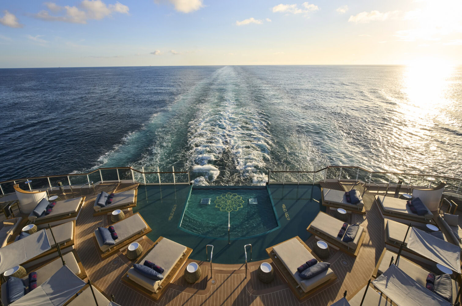 Rather than organized group activities or loud entertainment, the focus is on personal rhythm: wellness spaces, destination-inspired programming, elegant lounges, and expansive decks designed for conversation, reading, or simply watching the sea.