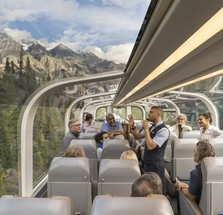 - All-day daylight rail travel through the heart of the Canadian Rockies