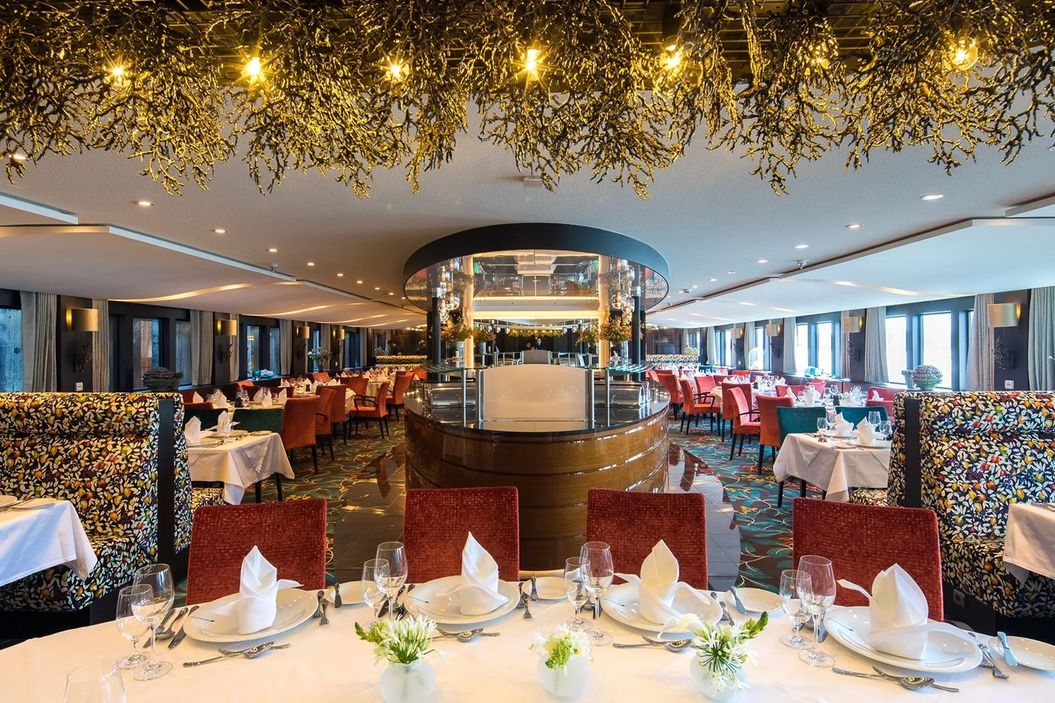 Dining aboard is a highlight, with the Main Restaurant offering a taste of the outdoors, complete with vines and branches woven into the décor. Expert chefs create exquisite cuisine from fresh, locally sourced ingredients, whether you’re dining in the Main Restaurant or enjoying the exclusive Chef’s Table experience.