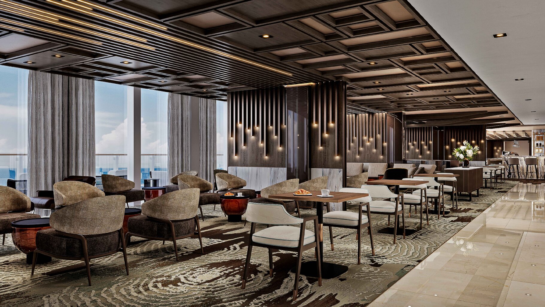 The largest lounge onboard, the Journeys Lounge offers an ever-evolving space for guests to relax and enjoy an array of experiences. Throughout the day, this vibrant venue transforms, featuring expert mixologists crafting innovative cocktails, enriching activities, and cabaret-style entertainment each evening. Designed to mirror the changing ocean journey, the lounge provides a dynamic environment where guests can unwind, socialize, and immerse themselves in curated experiences. Whether enjoying expertly crafted drinks or engaging in lively entertainment, this lounge is the perfect space for relaxation and excitement, from morning to night.
