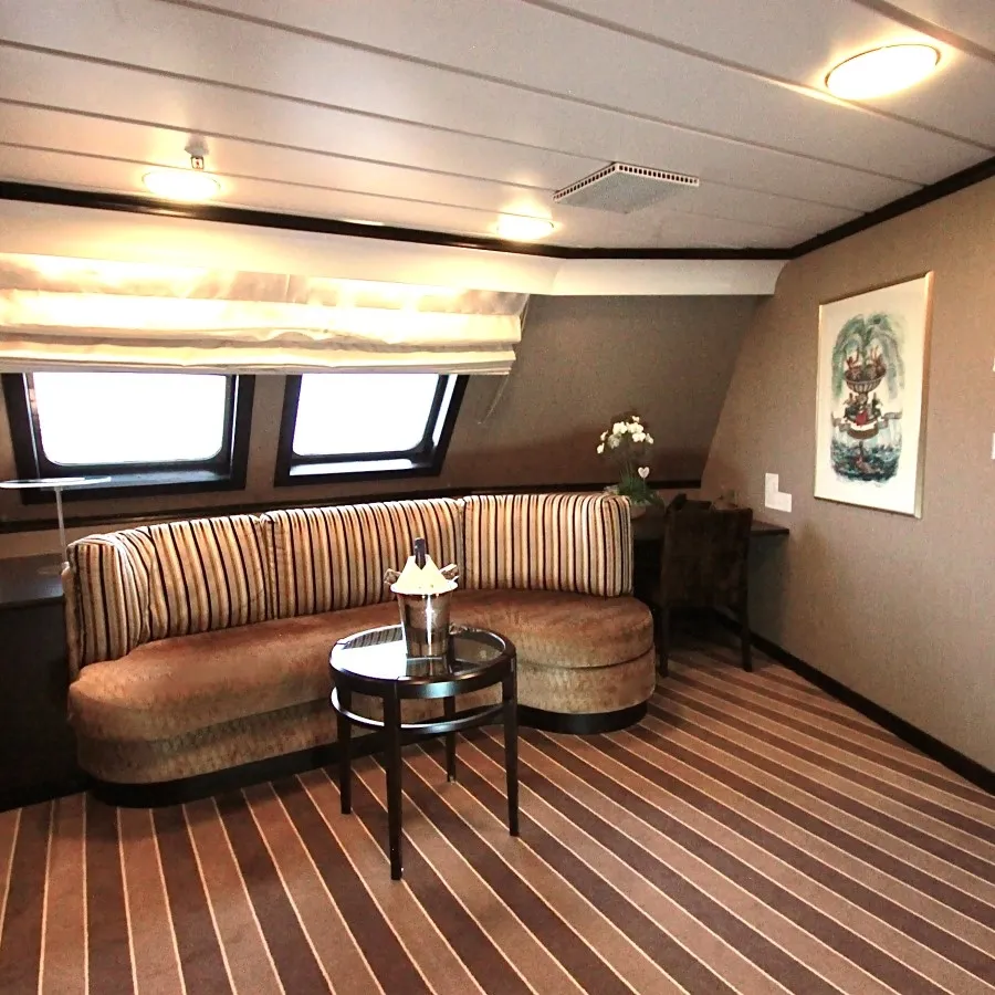 Mini suite on upper deck for up to 2 people. The suite comes with a double bed and sofa bed, full view, fridge and TV. Please note that we have wheelchair accessible cabins within this category, please contact us to book one of these cabins.