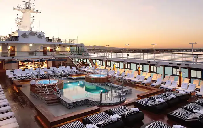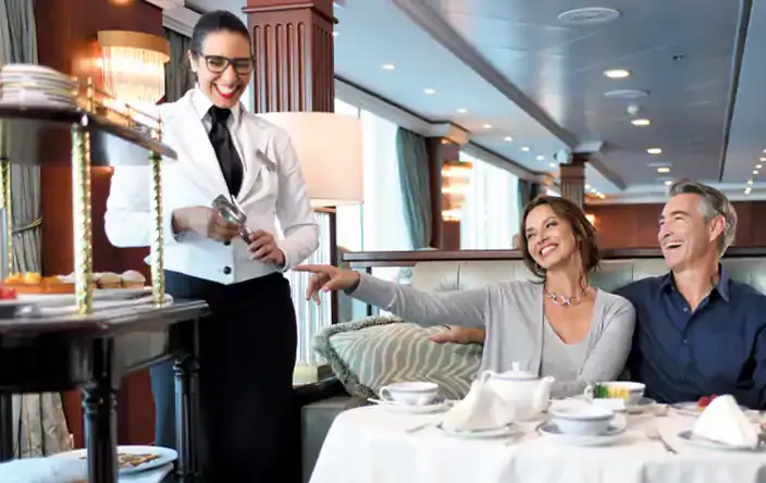 Her decks are lined with rich teak wood. Throughout the ship, custom stonework, elegant tile, and fine details showcase exceptional craftsmanship. Public spaces glow with soft, sea-inspired colors and refined furnishings. Whether you’re relaxing in a plush lounge, enjoying the quiet library, or sipping tea poolside under a navy umbrella, every space is designed for comfort.