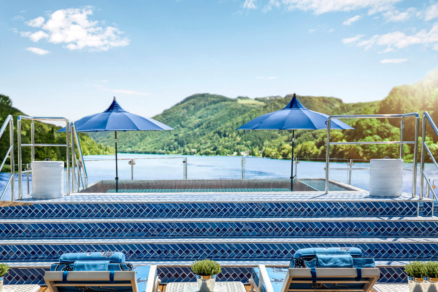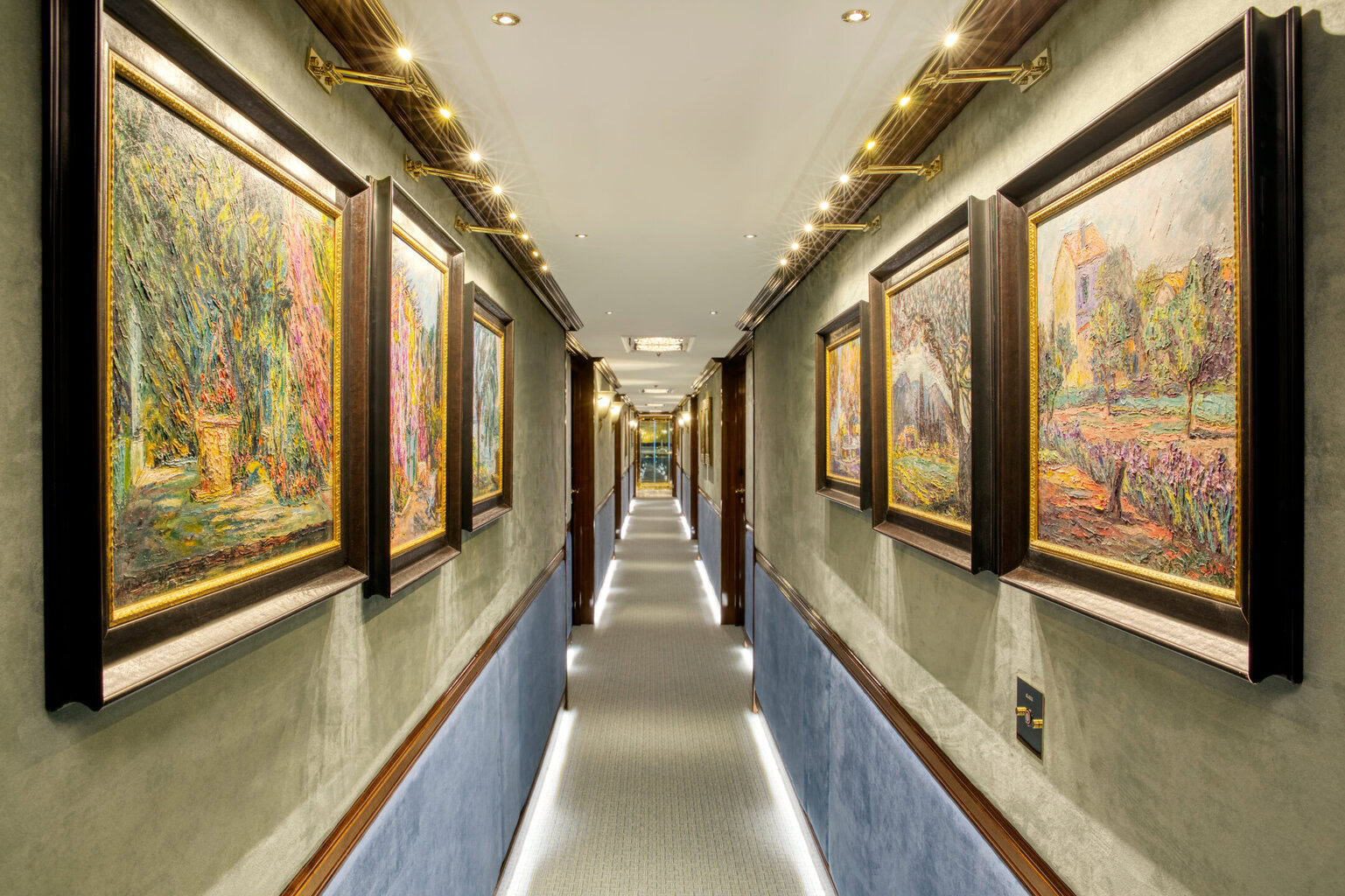 Luxurious riverview stateroom (140 sq ft - 13 sq m) with a French balcony Handcrafted Savoir Beds of England, built-in closets, hair dryer, safe, individual climate-controlled thermostat, direct-dial telephone, and flat-screen TV with infotainment centre Marble bathroom with Asprey bath and body products, plush towels, backlit magnifying mirror, cosy bathrobes and slippers