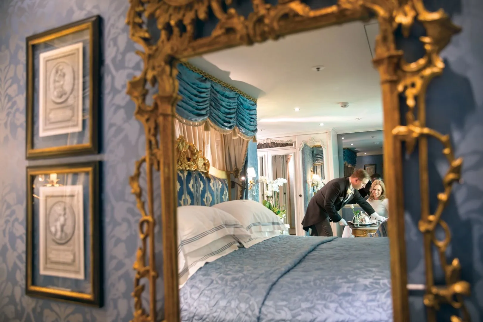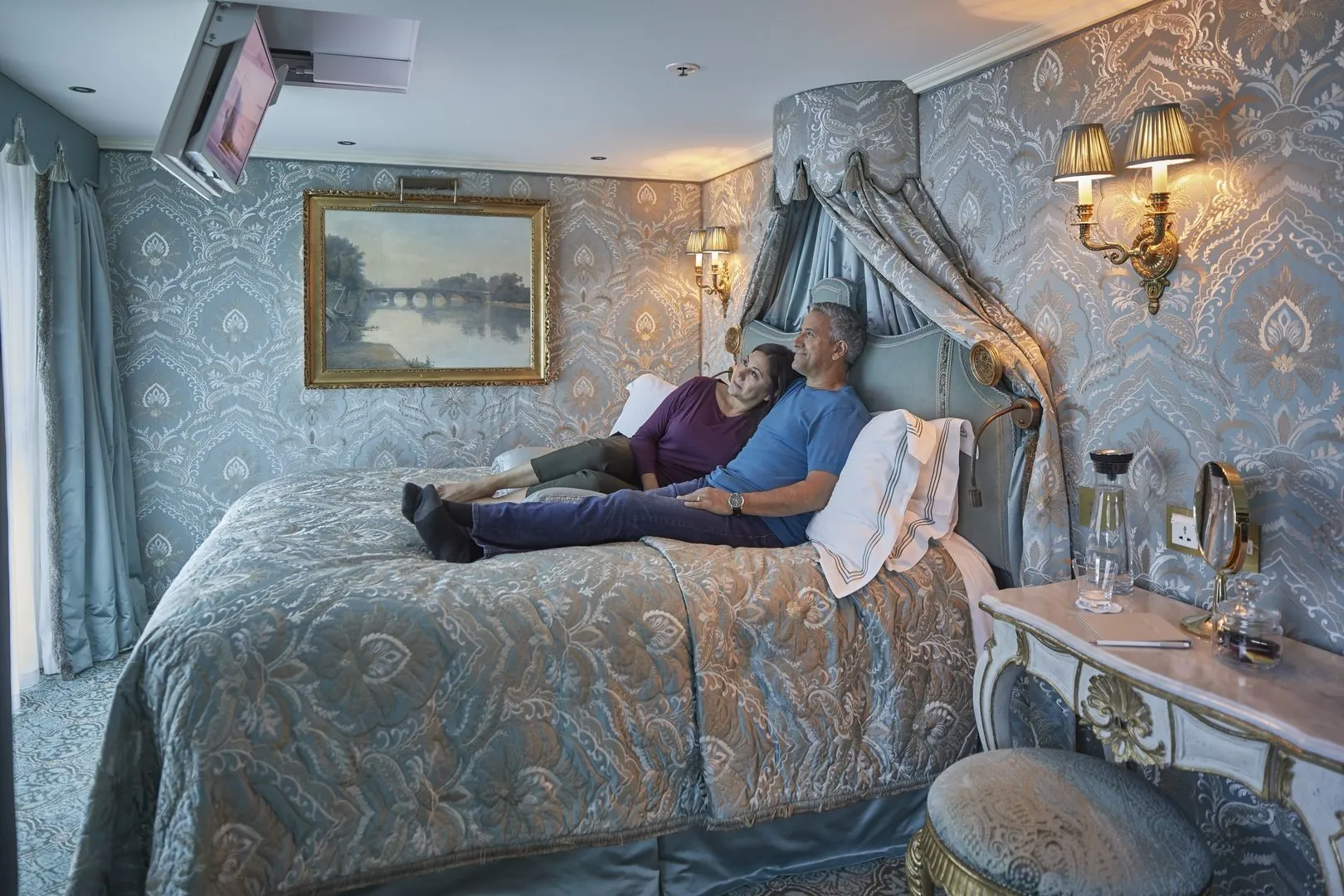 Lavishly appointed riverview stateroom (194 sq ft - 18 sq m) with a French balcony Handcrafted Savoir Beds of England, built-in closet, hair dryer, safe, individual thermostat, flat-screen TV with infotainment centre and satellite, and bottled water Marble bathroom with Asprey bath and body products, plush towels, towel warmer, cosy bathrobes and slippers