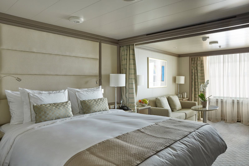 Located on the upper deck, and offering spectacular sunset views, the Superior Veranda Suite has all the comforts and luxury that you can expect aboard. A comfortable living space, attention to detail and a generous expanse of amenities, this stunning suite makes for a cosy home while on the seas. But perhaps this suite’s finest asset lies just outside, as floor-to-ceiling glass doors open onto a private veranda, making every sunset feel as if it is yours alone.