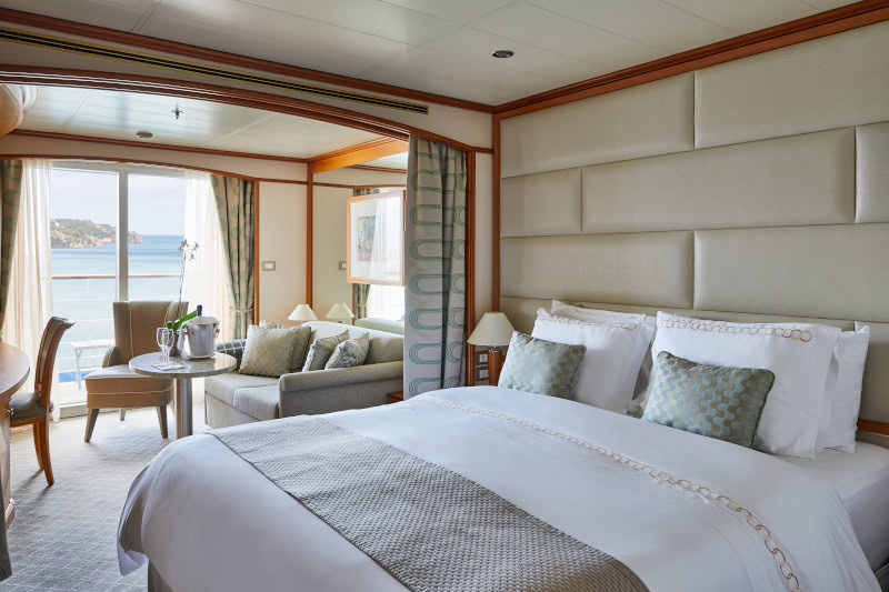Expertly designed and exquisitely appointed. Ideal for entertaining friends while you cruise or enjoying a quiet dinner “at home”. Available as a one-bedroom configuration or as two-bedrooms (as illustrated) by adjoining with a Silversea Veranda Suite.