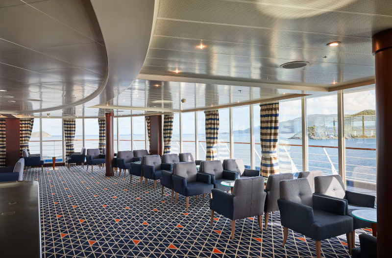 A quiet sanctuary. The sitting area of the Vista suite has plenty of room to relax. Large picture windows frame panoramic ocean views. The perfect backdrop for breakfast in bed during the cruise.