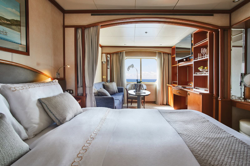 The Deluxe Veranda Suite offers unbeatable views. A Silversea signature. Spacious and welcoming. Floor-to-ceiling glass doors open onto a furnished private teak veranda. Each spectacular sunset feels like it is yours alone. The Deluxe Veranda Suite offers a preferred central location with identical accommodation to a Veranda Suite. No top cruise line would be complete without such a luxury.