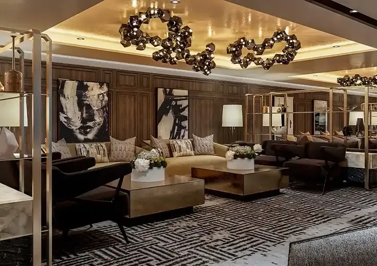 Spanning the full beam of the ship, each of the three Owner’s Suites on board Vista boasts more than 2,500 square feet of luxury. Adding to the spaciousness, floor-to-ceiling windows in every room create an airy atmosphere filled with natural light and surrounded by extraordinary views. These seagoing suites are styled exclusively in Ralph Lauren Home in a harmonious symphony of new furniture introductions and iconic classics. The dramatic double-doored entry opens onto a grand foyer that leads to the dining room, where an arching wall of glass overlooks the sea. The centerpiece here is an elegant Brook Street Salon dining table surrounded by Holbrook Director’s Chairs from Ralph Lauren Home, while the adjacent living room showcases a pared-down approach to modern furnishings with a nautical flair and glamorous accents. A chic rosewood cocktail bar stands ready to entertain, and another wall of glass opens onto an expansive teak veranda. The master bedroom is an entire retreat unto itself, featuring a luxurious Cote d’Azur king-size bed, capacious walk-in closets, and an opulent master bath with a large soaking tub and an ocean-view shower. A second teak veranda off the master bedroom promises peaceful solitude amidst the refined elegance.