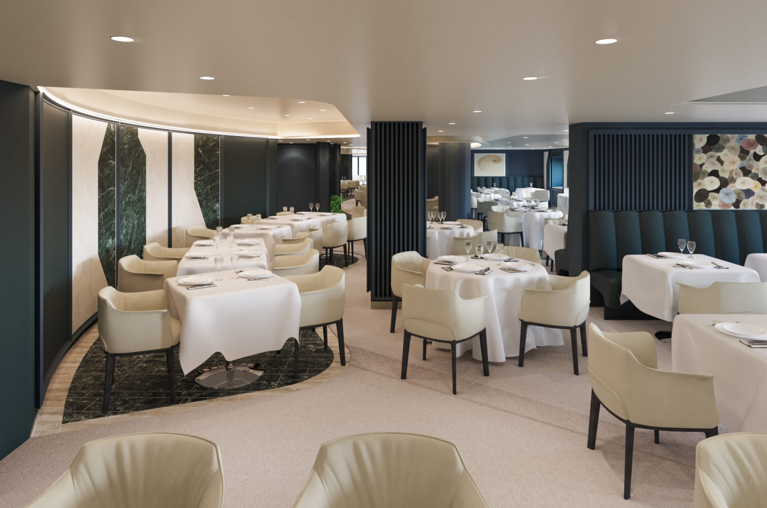 Design Note: Inspired by modern Parisian brasseries, the interiors are refined but intimate—ideal for romantic dinners while sailing past the cliffs of Santorini.